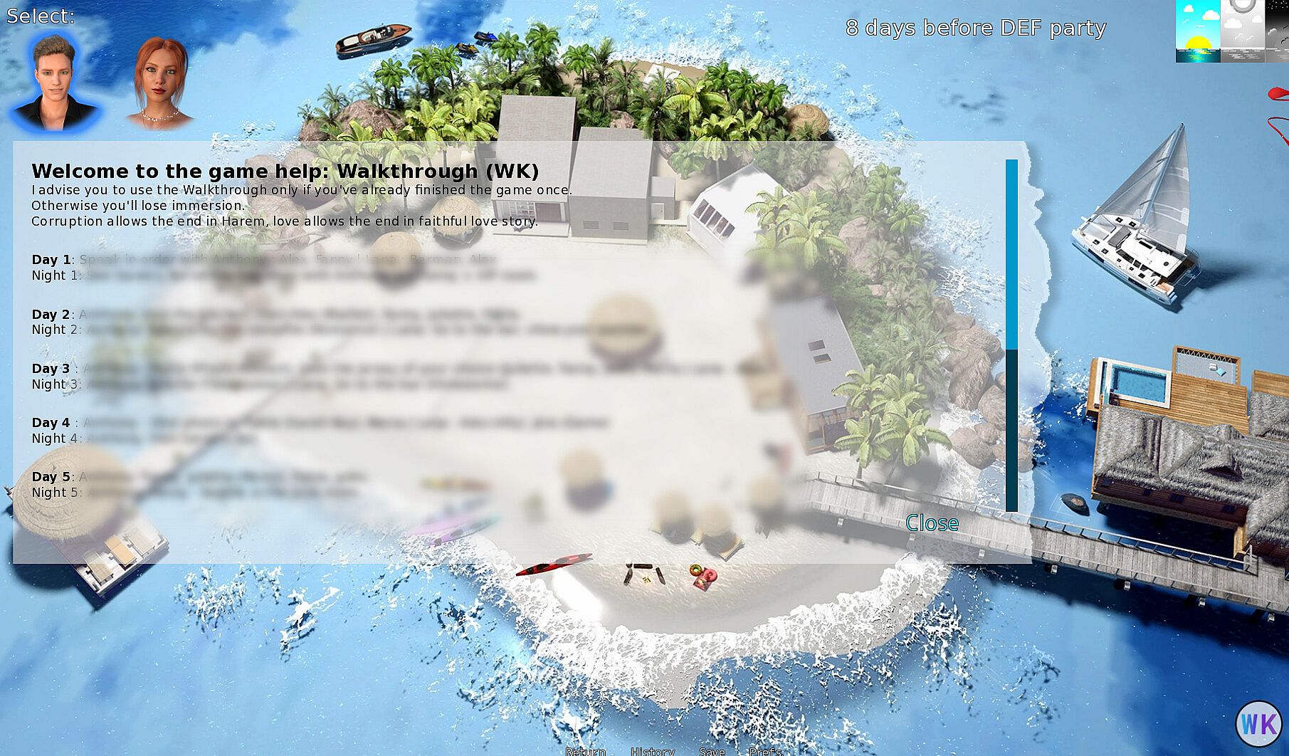 • A guide accessible while navigating in the game, providing you with the optimal order of characters to meet in order to unlock all the game scenes.