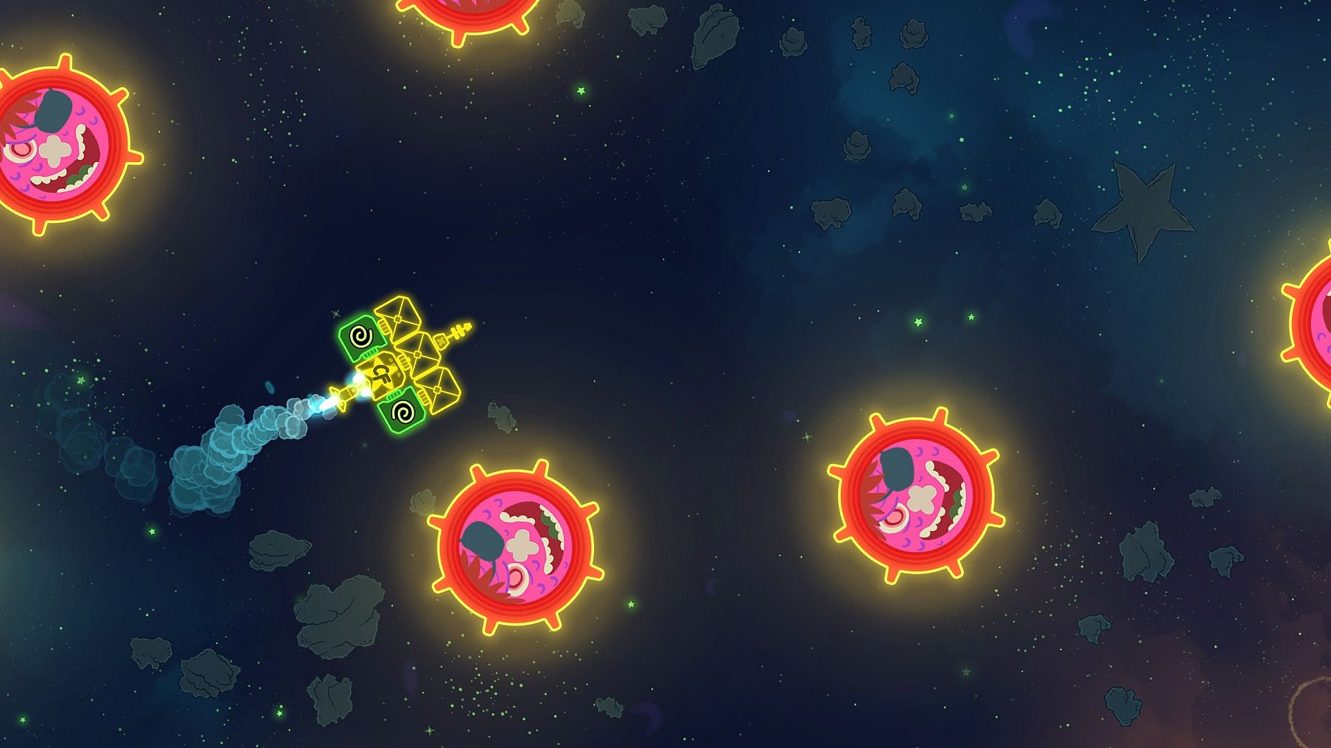 You built your spaceship out of Plasma Cannons, bulkheads, and a couple of Twin Thrusters. Just ahead there's a massive enemy vessel bristling with MegaBoom Missiles. You want those missiles. You need those missiles. You dart forward and maneuver deftly between the spinning RipSaw blades on the front of the enemy craft and blast away at the Command Core. BOOM! It explodes leaving behind a haul of weapons and thrusters. Those MegaBoom Missiles are free for the taking. You quickly attach them to the front of your own ship, making it much larger and more powerful...