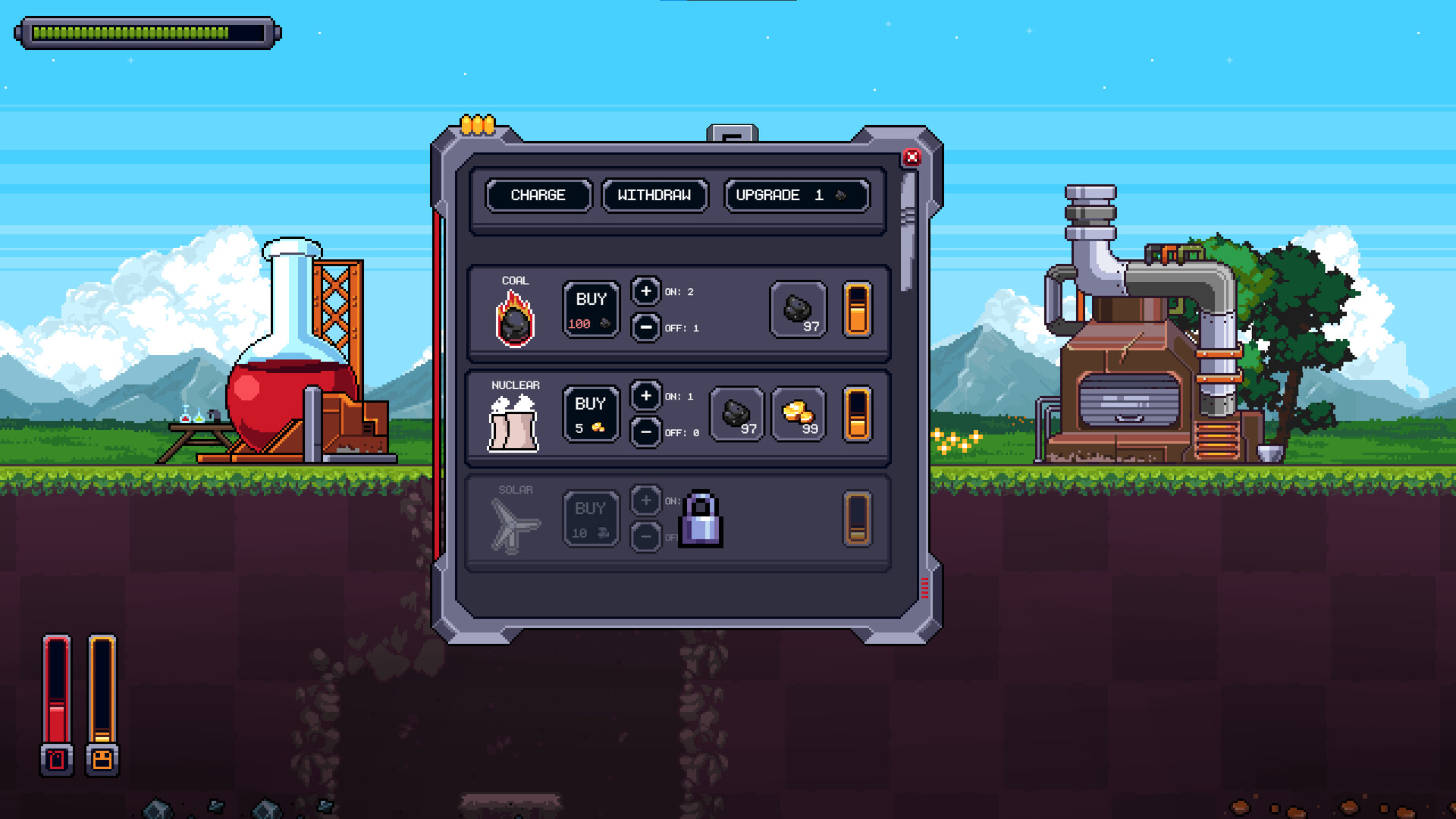 • Refill your fuel manually, or by using your resources to create energy automatically.