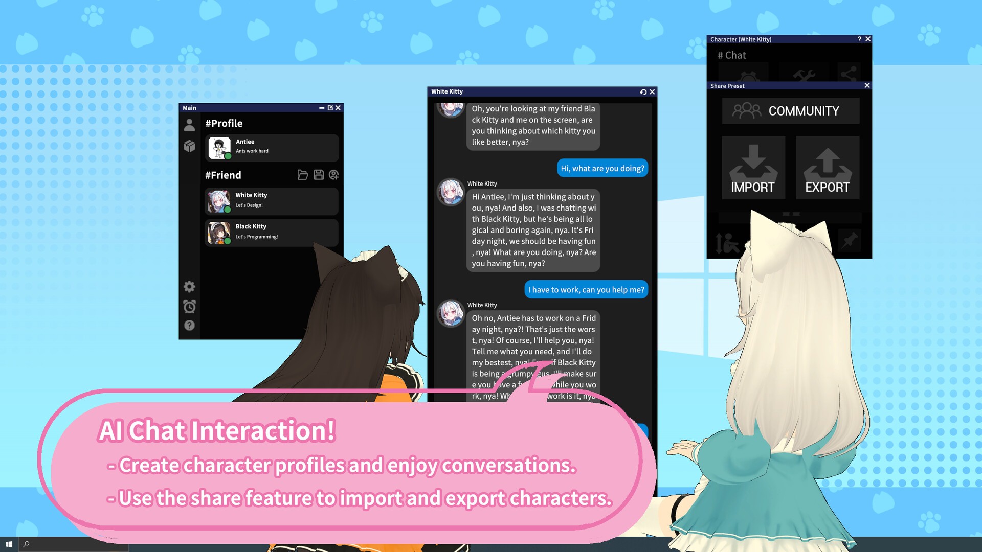 Desktop Maid is a live desktop interaction application designed to bring life and charm to your daily routine. Whether you're studying, working, or relaxing, your AI companion stays by your side, making every moment a little more special.