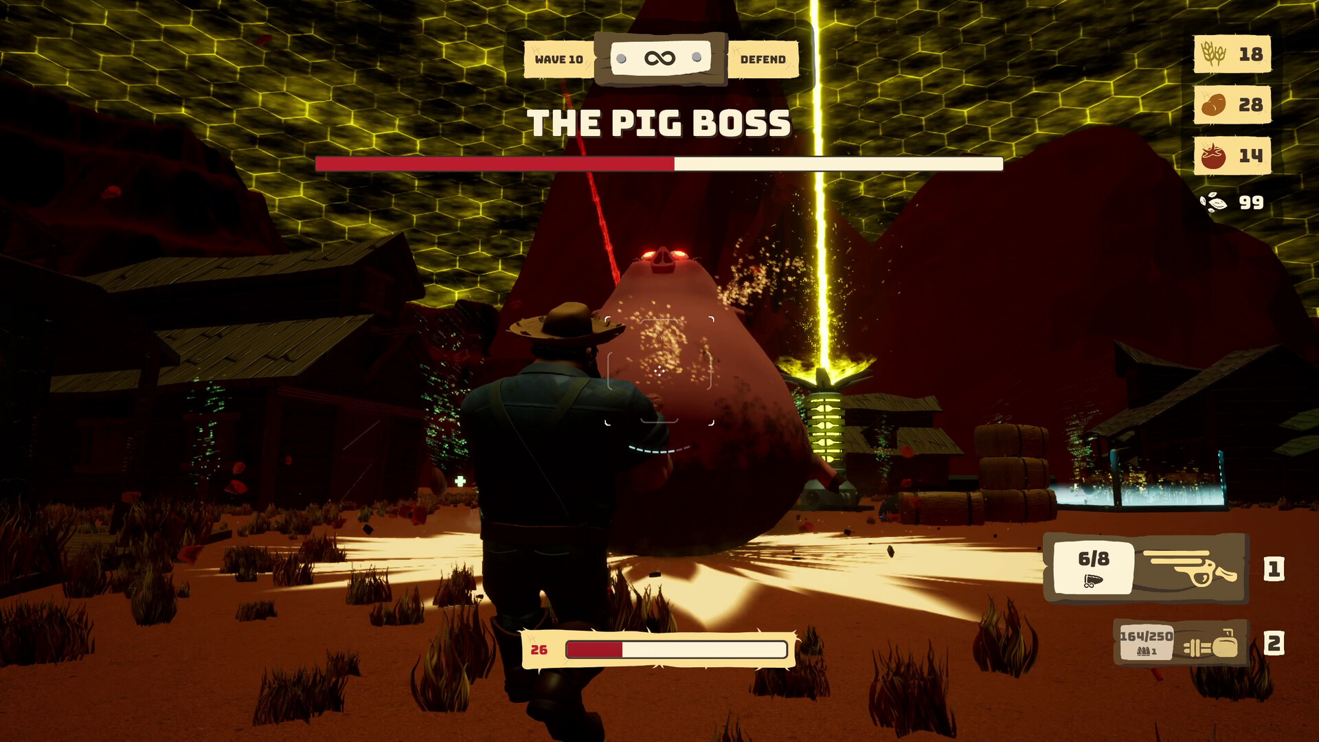 Once night falls, all hell breaks loose. Your farm animals are now possessed by the local alien species, they attack your defences, trying to get to your dome generator in order to disable your only protection against the emptiness of space.
