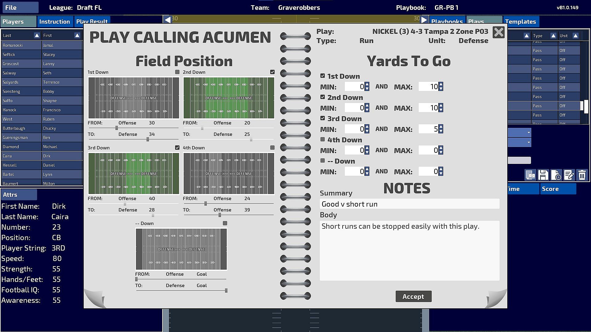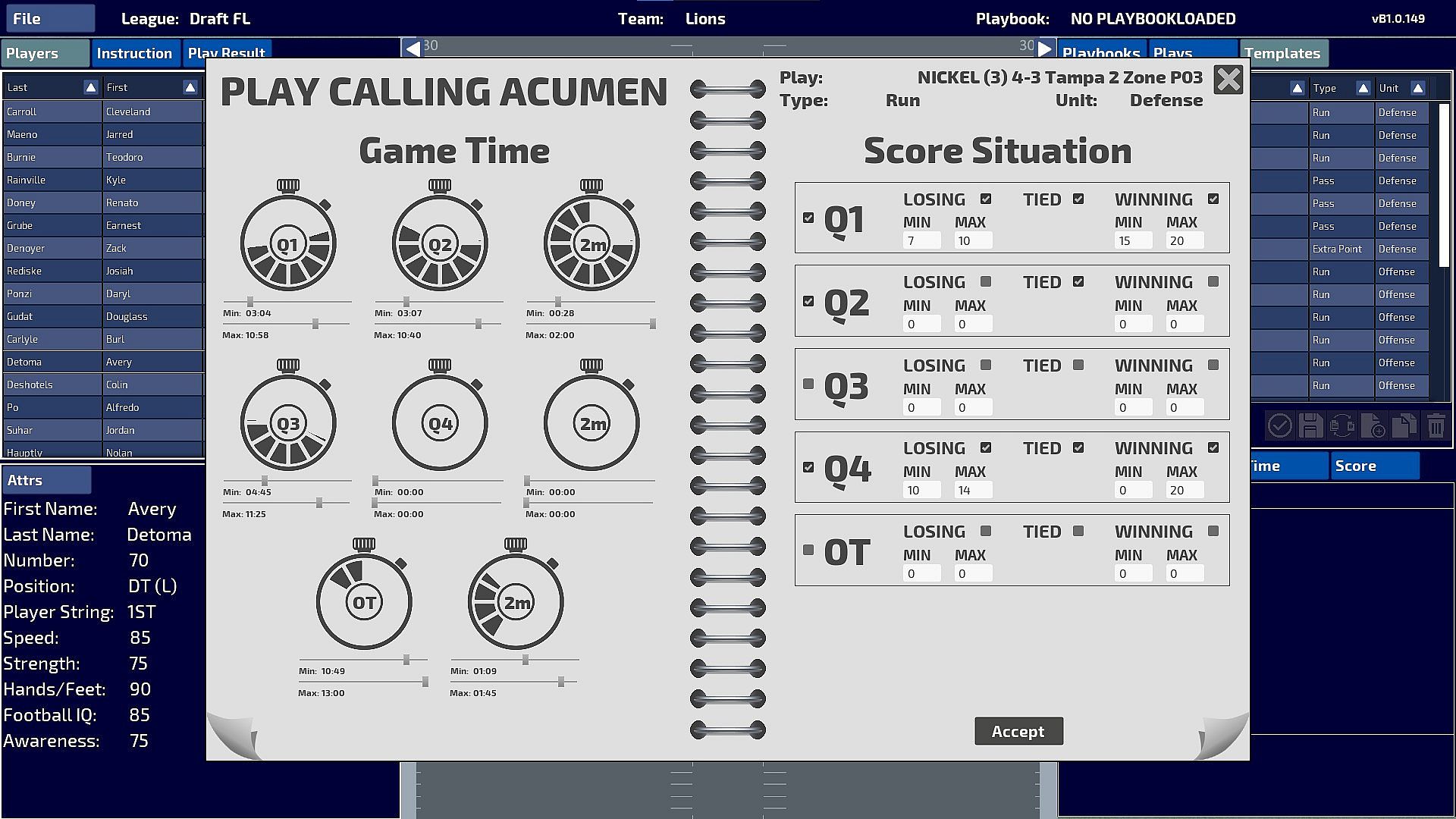 As Head Coach, you determine when and where each play is called using the Play Call Acumen system. You determine the down, distance, score differential, and timing. You’ll also set the penalty/reward points depending on how that play does so that you don’t keep calling the same bad play over and over, as well as making sure you call the plays that are working well. You are in total control of the team.