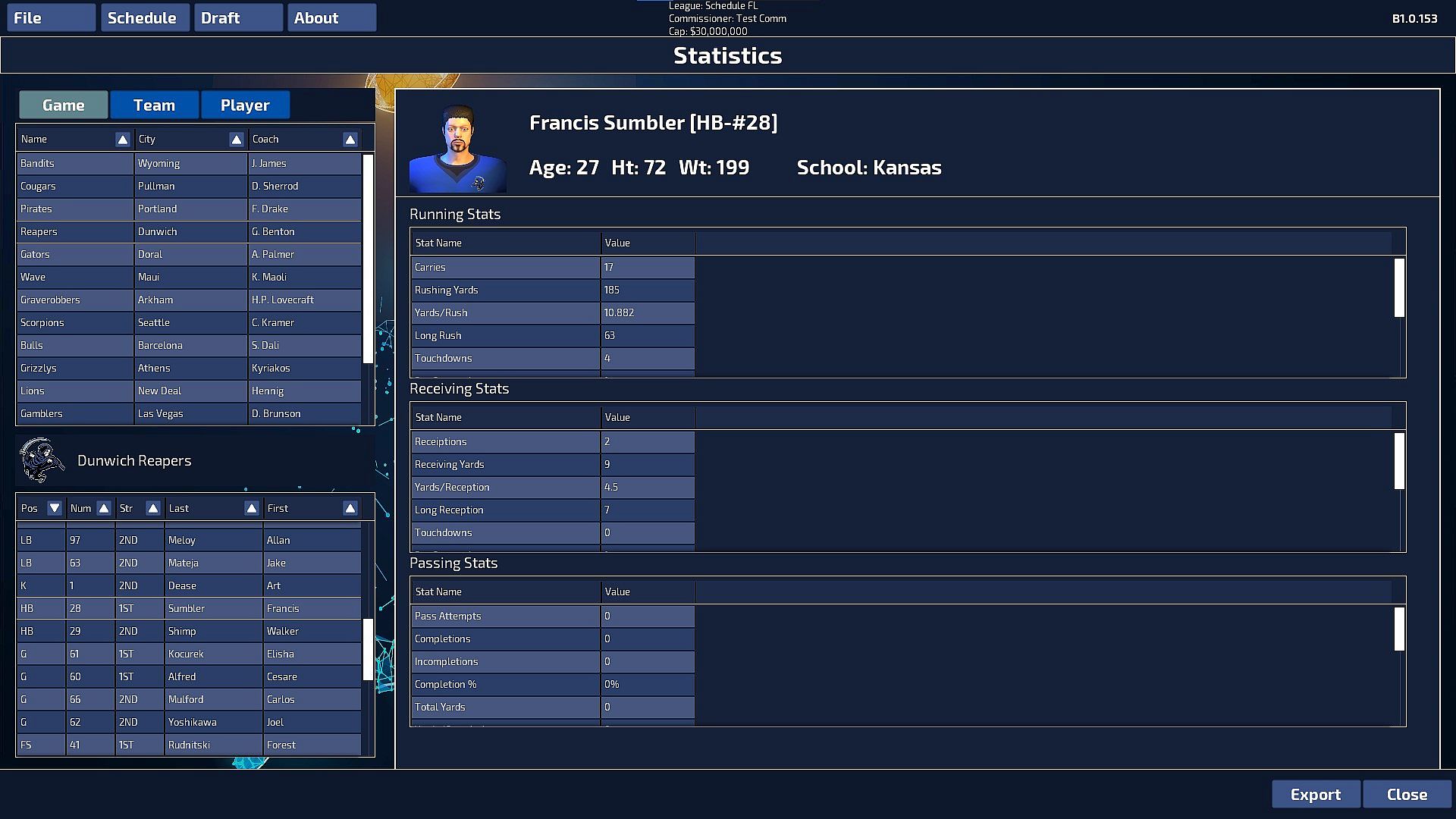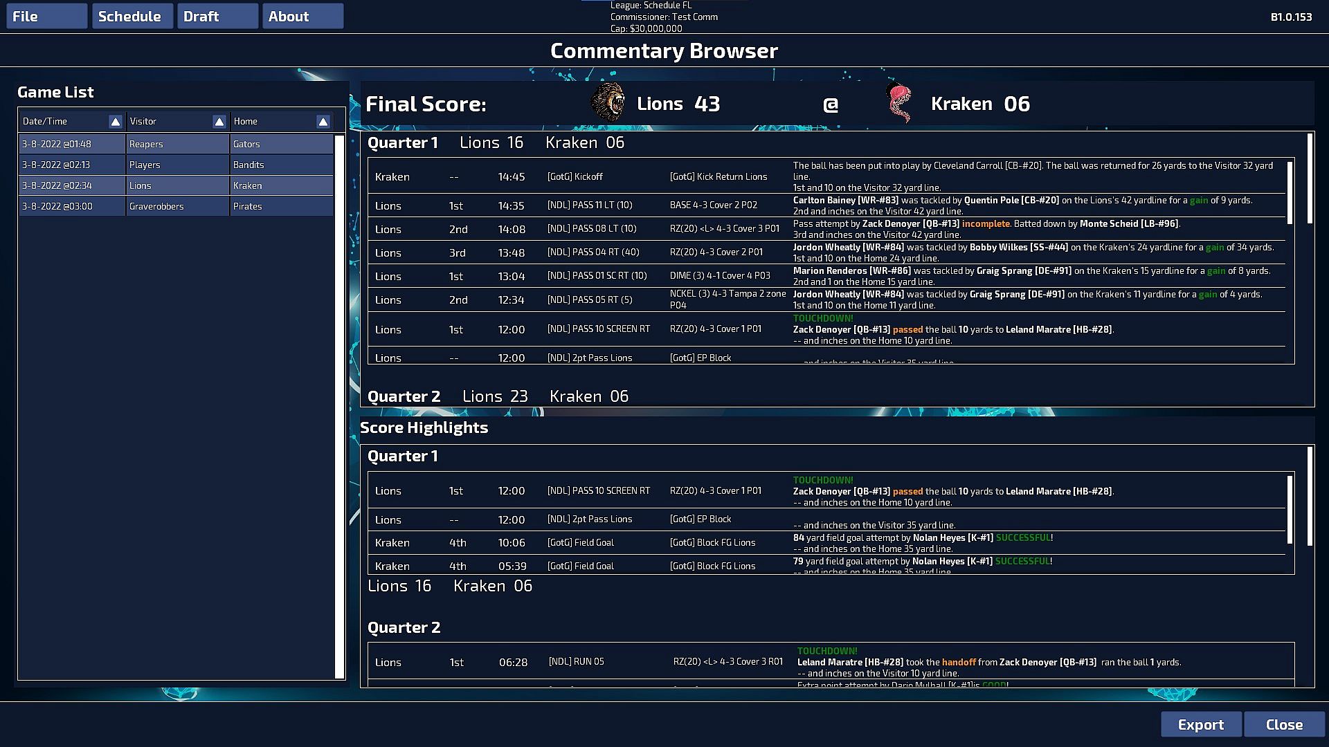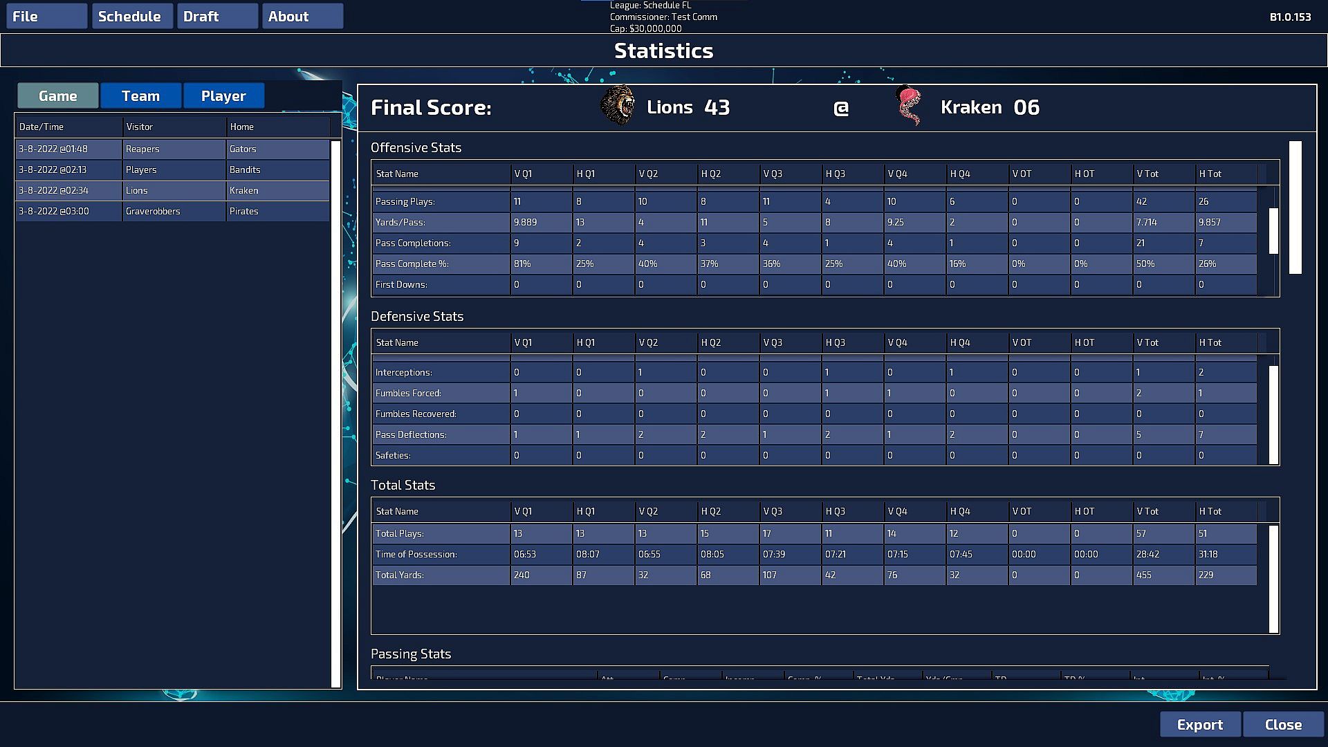 Additionally, there will also be available comprehensive Game, Team and Player statistics and commentary, so that coaches can fine tune their teams during drafts and playmaking. These data will be fully exportable to delimited files so that they can then be imported into your favorite analysis software for real scrutiny.