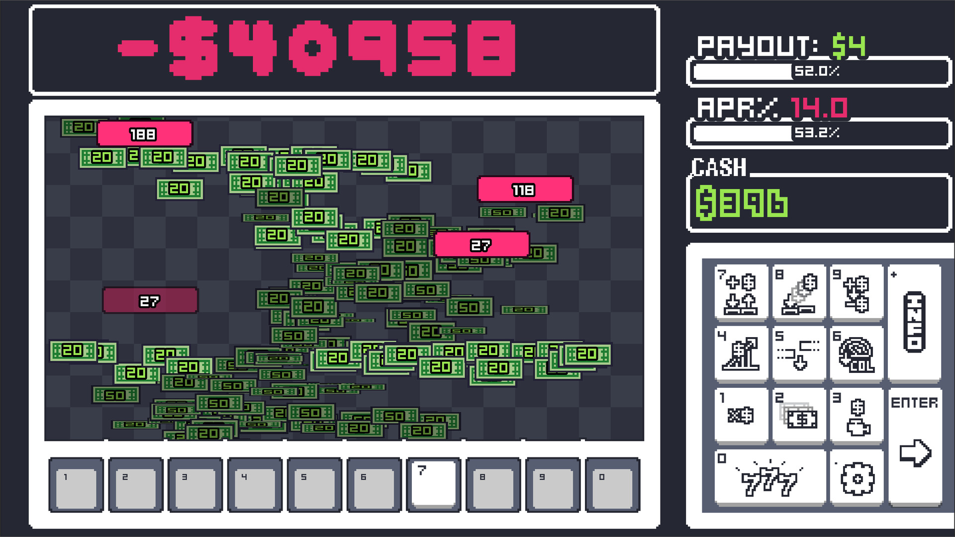 You have two things, debt and a number key pad. Use the number keys on your keyboard to pay your debt in this capitalistic clicker debt paying simulator.