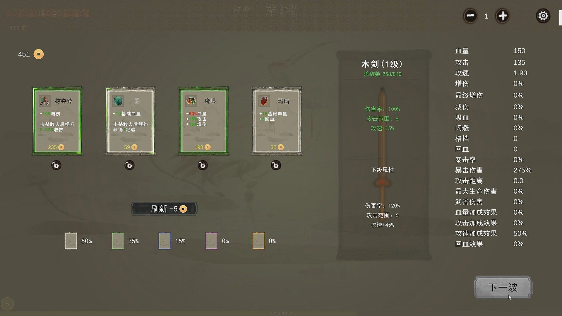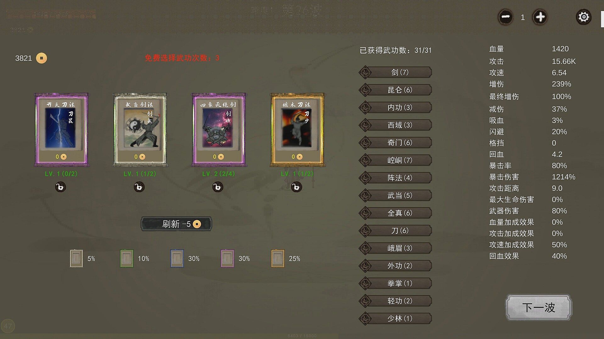 After each level, choose randomly refreshed kungfus and props, activate dozens of bond effects, and each game is a unique growth path!