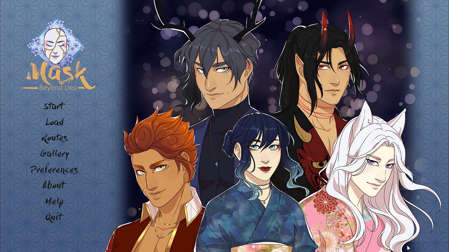 Mask - Beyond lies is an Otome Game set in a fantasy world full of Yokai. As you are transported in in another world, a masked person guides you through the day to the exit to go back to your world. But will it really be this easy ?