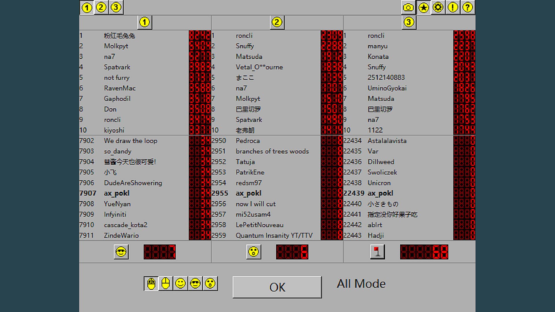 Po zakończeniu gry wynik jest zapisywany na liście najlepszych wyników. W grze są pięć tablic liderów, które pozwalają graczom rywalizować w różnych umiejętnościach.