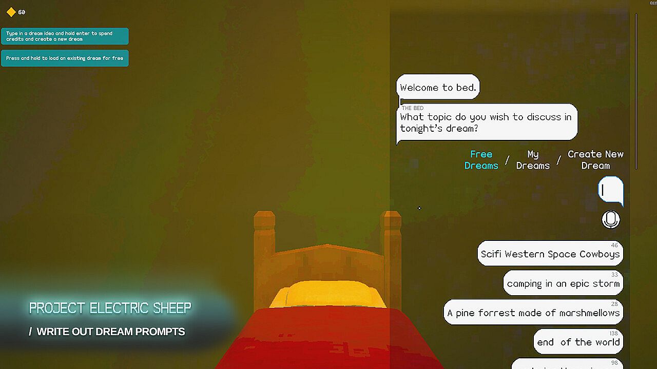 Tell Project Electric Sheep what you wish to dream about and dive into a visual interpretation, where you talk about your dream with virtual conversational characters in a 3D space. The base game comes with 1500 credits, or enough to create up to 15 unique dreamworlds. After that, more credits are available in-game on a pay-as-you-go basis, for creating dreams and replying to NPCs.