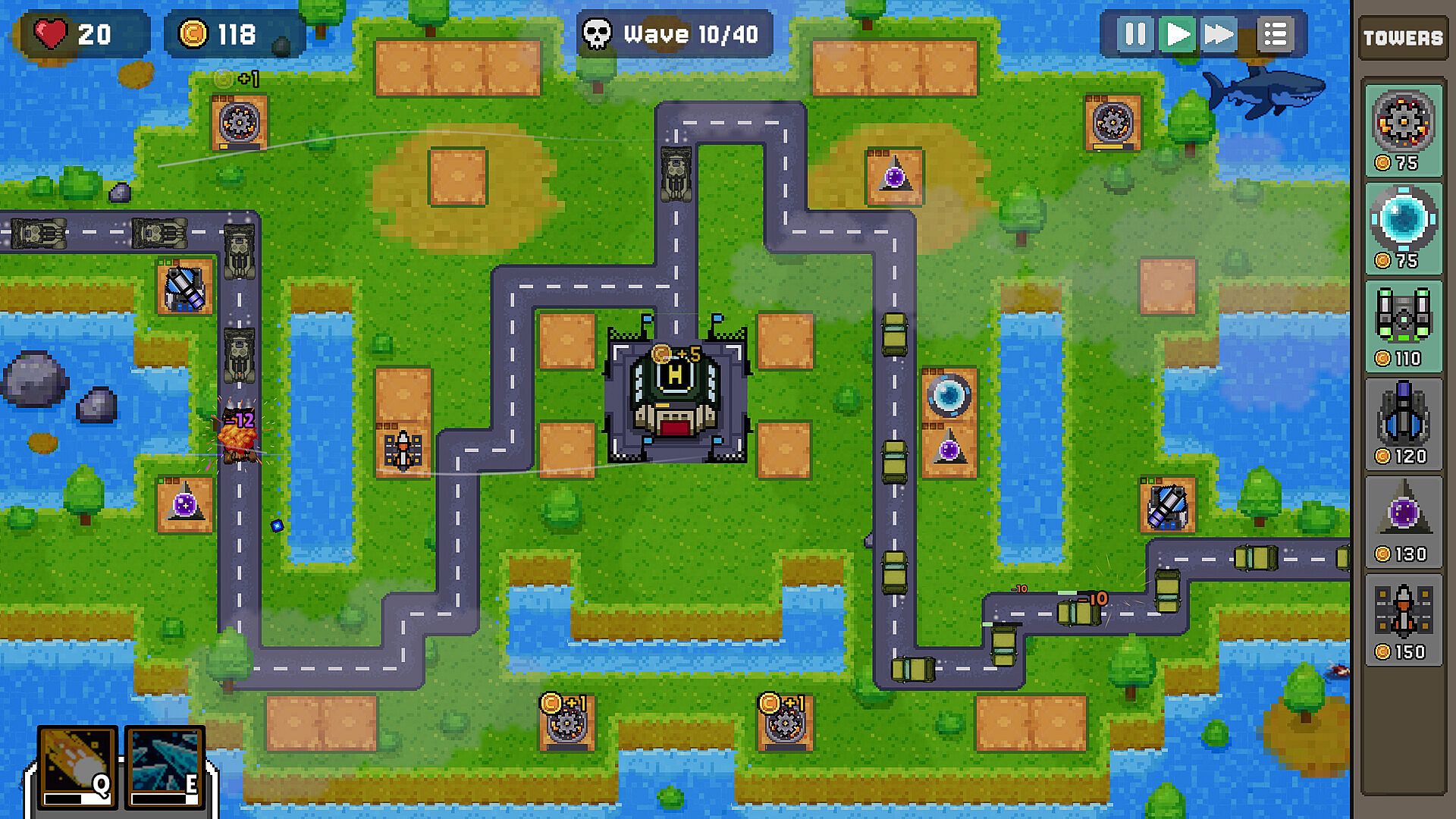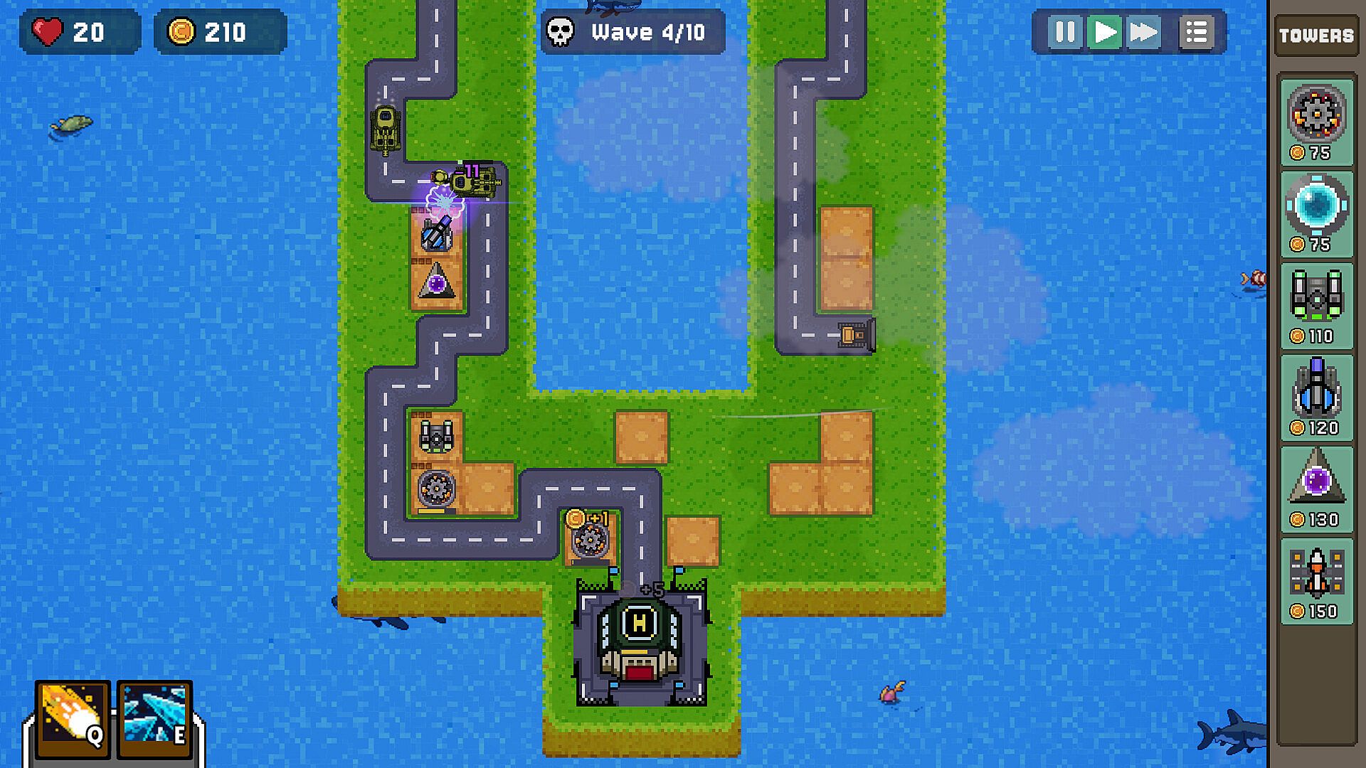 Eight different towers to place, each with their own roles, including simple damage dealers, resource generation and crowd control.