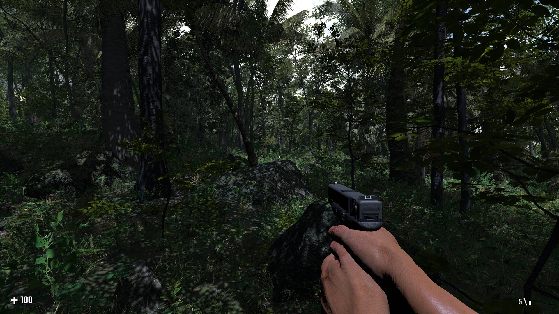 Surrounded by waves and sand, you begin to make your way inland, through dense forest.