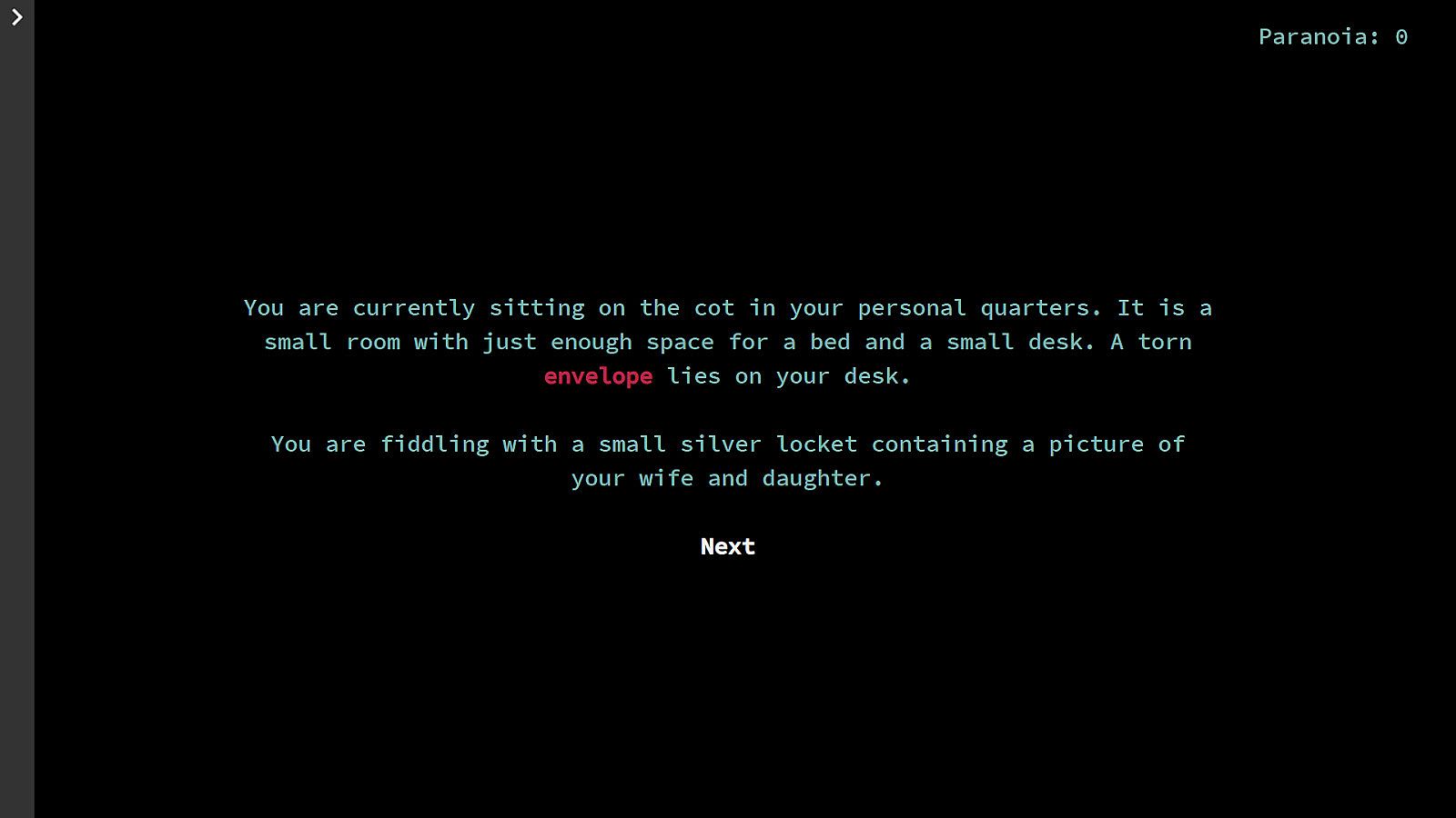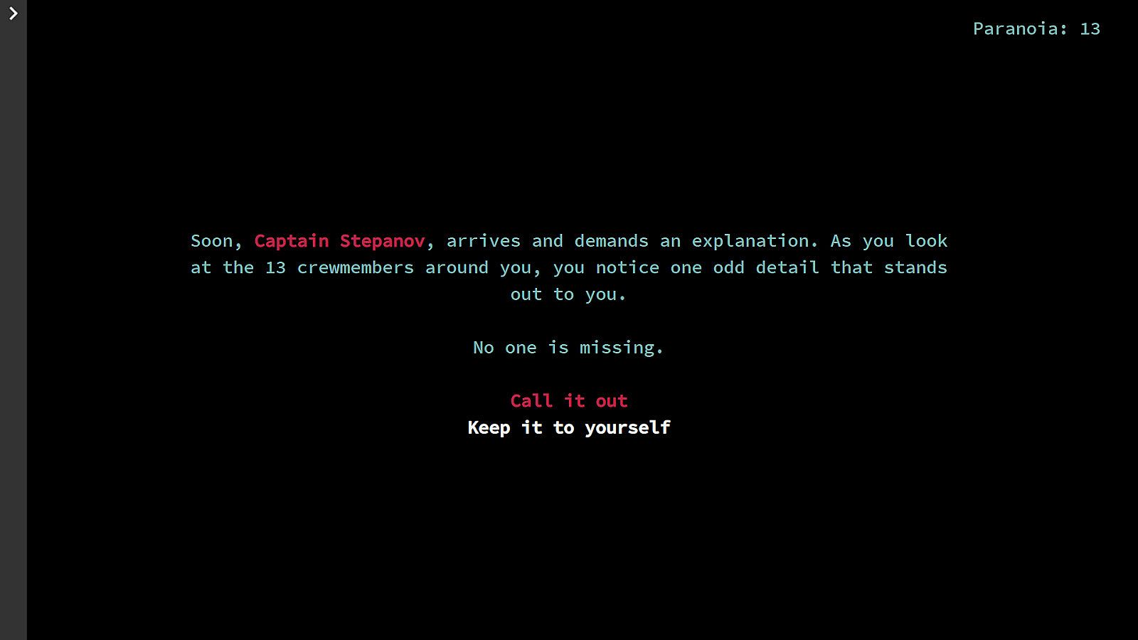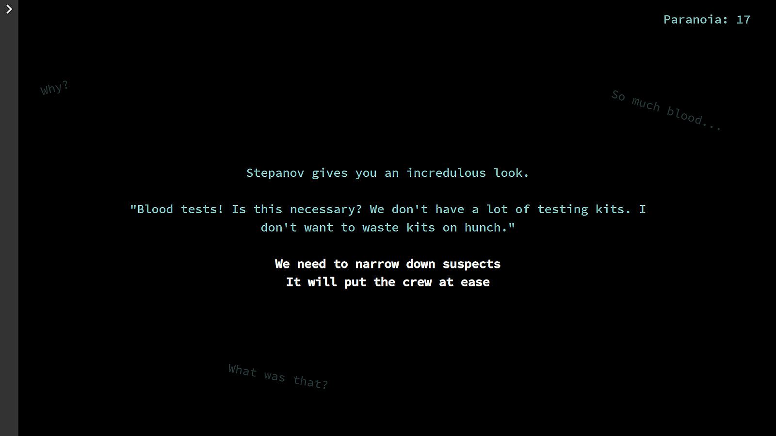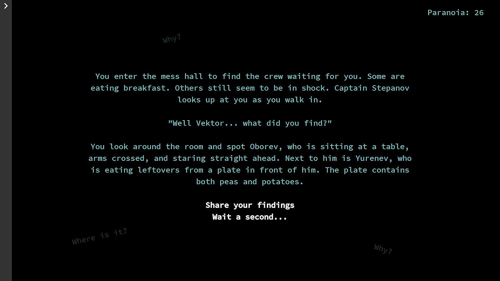 The player will take the role of Vektor Pavlov, a scientist aboard the Peresmeshnik during the Cold War. A creature has boarded the ship and is stalking the crew. As the player, you will make meaningful choices that will affect the outcome of the story as you navigate the halls of the Peresmeshnik and escape the terrors that stalk you. All while managing your paranoia.