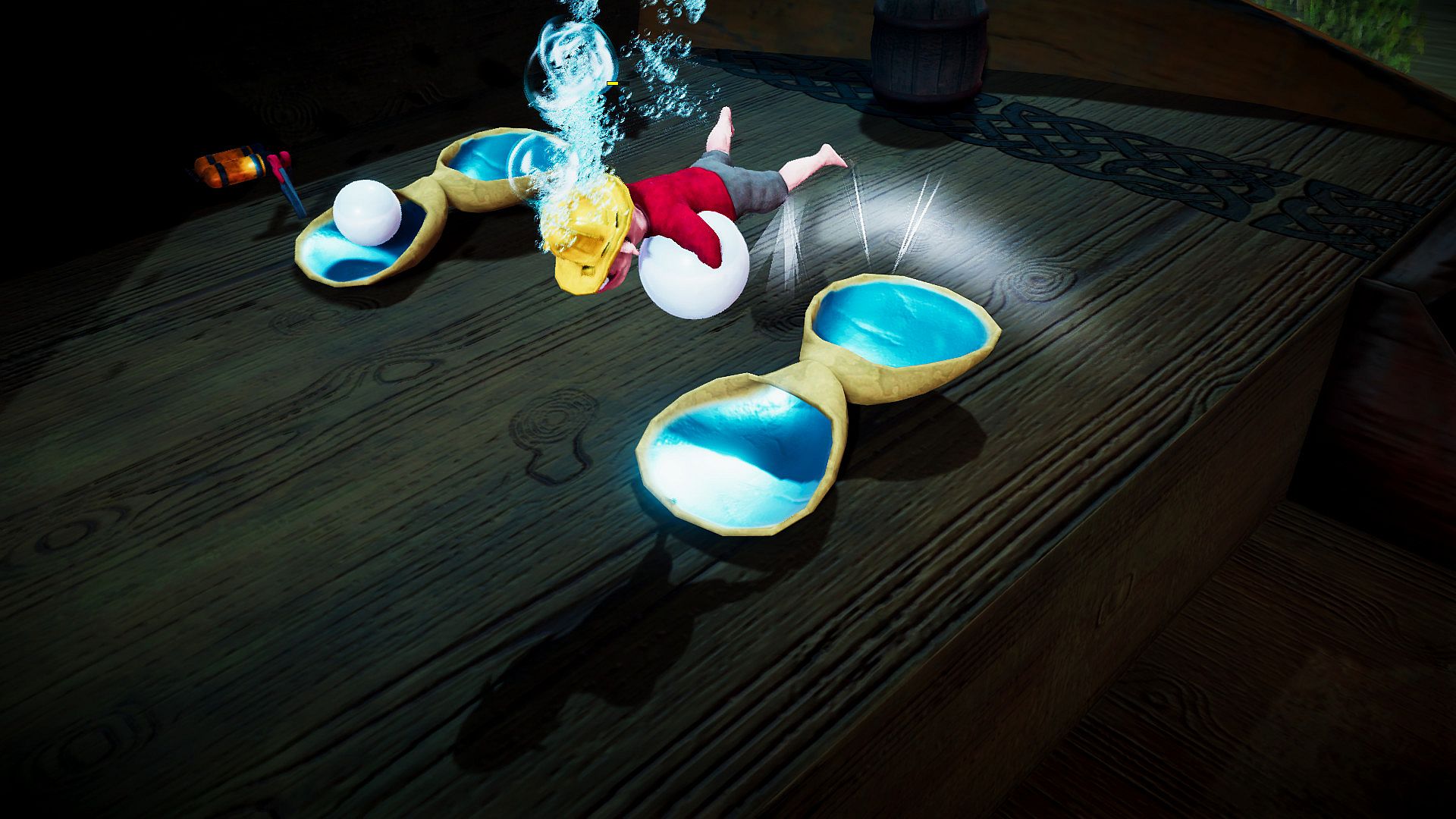 In the minigame Pearl Diver you dive for pearls. Take these out of the water to get points. But be careful, because you have limited breathing air available and your unscrupulous opponents will try to pull you under the water until you run out of air. Collect scuba tanks and flippers to give you an advantage and keep your opponent under the water.Steel Beam