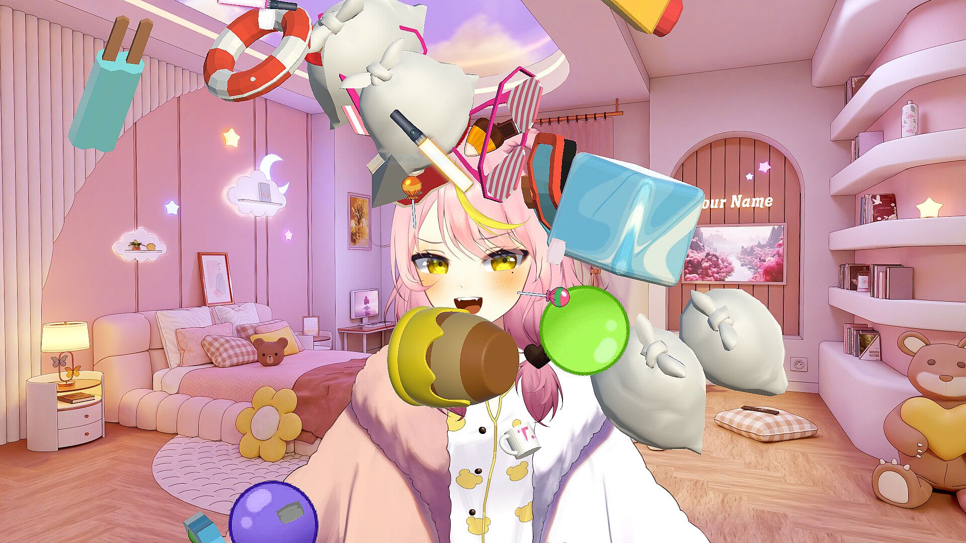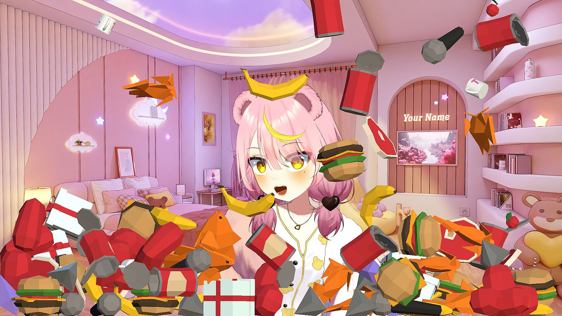 Set up reactions to your Twitch events! Customize what happens when viewers donate, follow, subscribe, or cheer – from throwing virtual objects to triggering animations. Watch as digital pies, plushies, or even random 3D items fly your way in real-time!