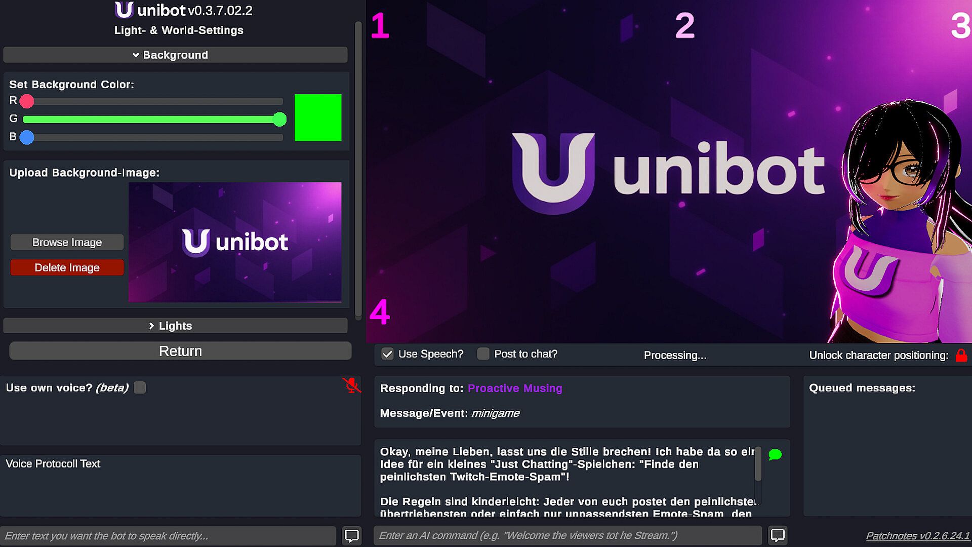 Deep AI Personality & Visual Customization: Define every aspect of your UniBot's persona: its name, backstory, tone, speaking style, and behavioral rules. Make your custom AI chat bot witty, informative, a helpful moderator, an entertaining sidekick, or anything you can imagine to perfectly match your channel's unique brand. Further personalize its visual identity by using your own 3D VRM (Vroid) models or a fully customizable 2D avatar, bringing your AI co-host to life on screen!