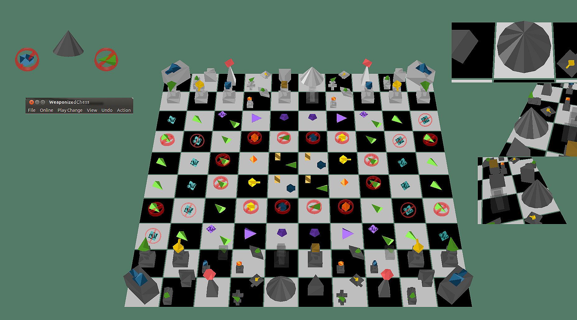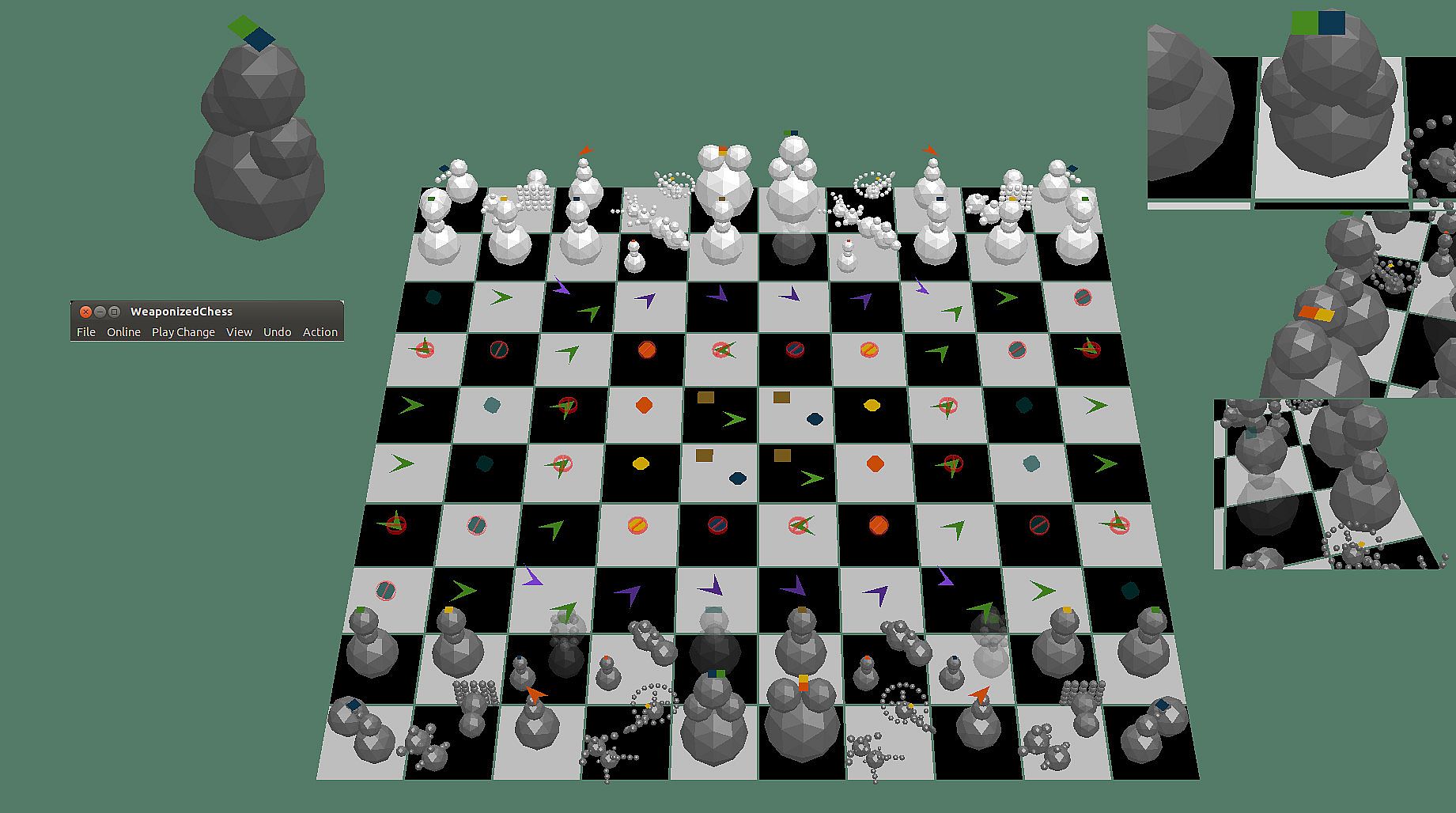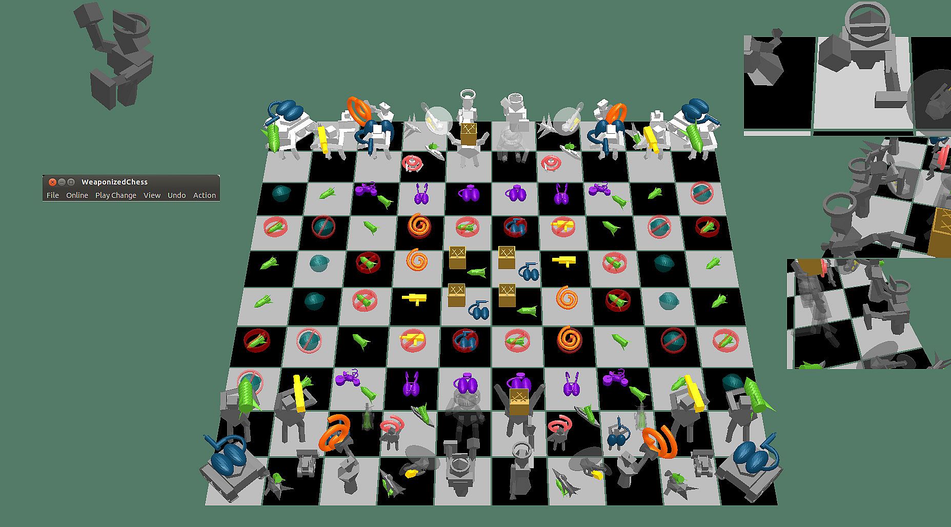 This version of WeaponizedChess is more interested in the game being clearly displayable than in the game graphics being a spectacular example of computer animation. Those who are only interested in a game where the graphics are pure eye candy should play some other game. This game is about thinking. It is not about looking. This game is fun because you use your mind to see the pieces, to see all the possibilities. Chess has always been like that. The simple-geometric set of pieces will always be drawn quickly and clearly even if hardware acceleration is not available.