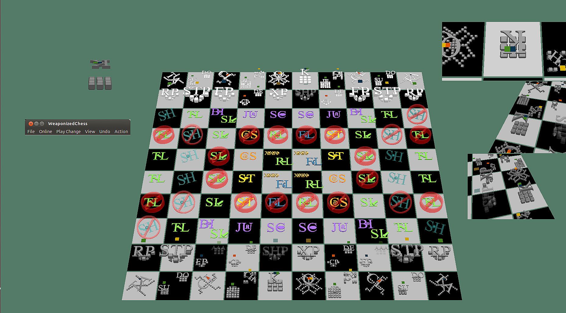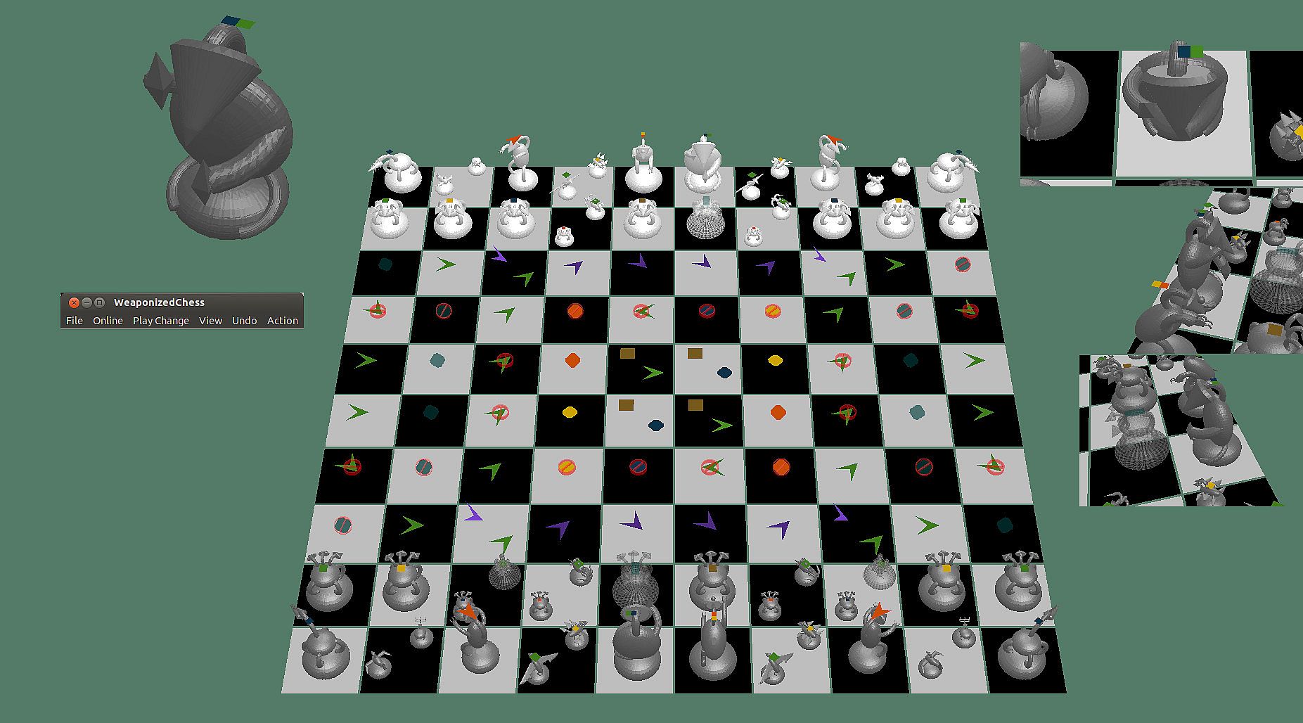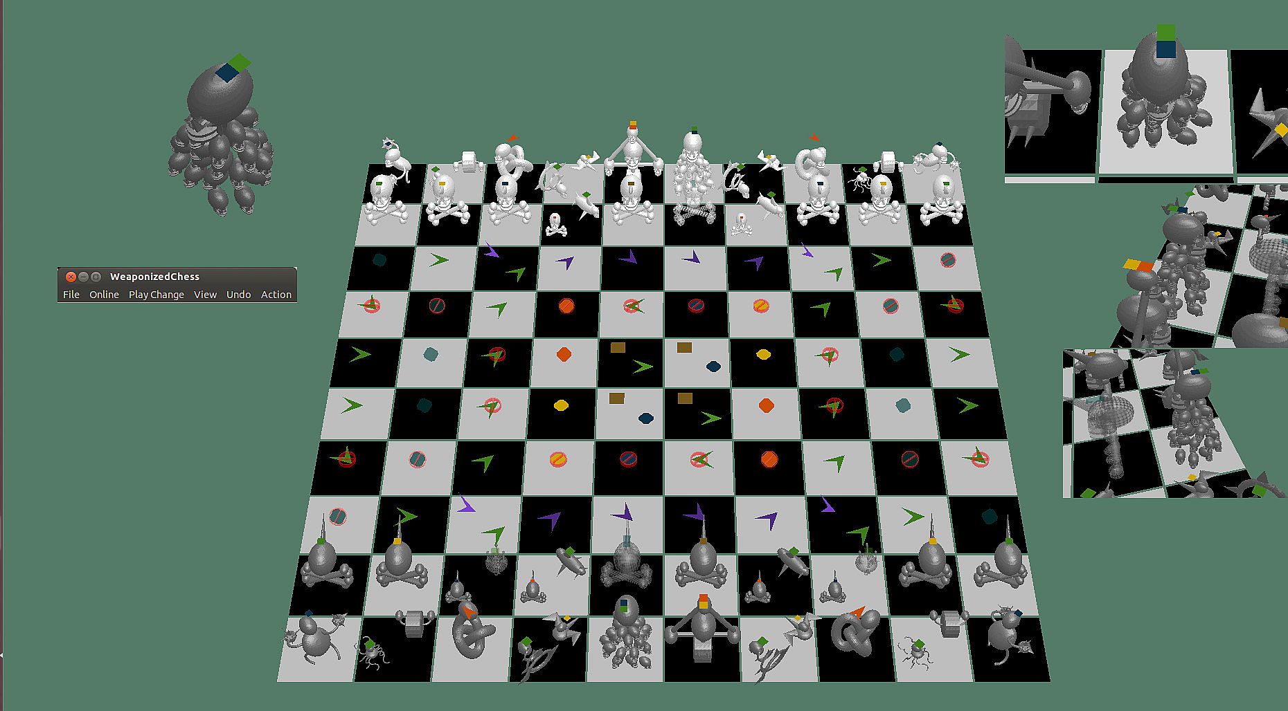 WeaponizedChess is derived from regular chess but makes many changes. It adds weapons, three-dimensionality, and tunable stealth. It is a more modern version of chess. Old chess is about knights capturing kings. Modern war is not like that at all. WeaponizedChess is about stealthy, weapon-armed pieces contending on a modern battlefield. Have no fear, the basic nature of chess is retained: black-and-white checkerboard, one side moves then the other, defeating the enemy king is still the goal.
