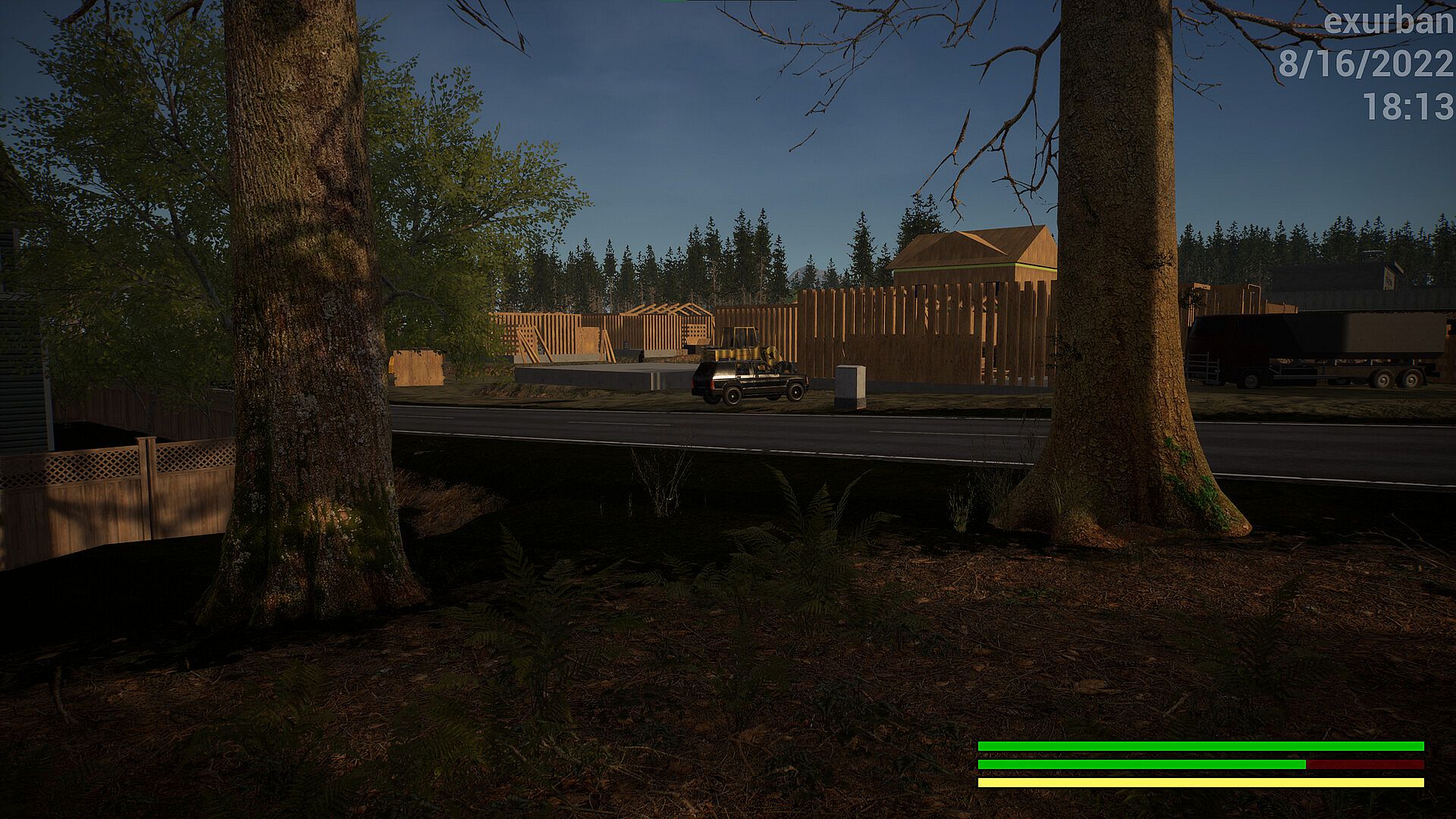 It's getting dark now, you need to rest but it isn't safe here. You know of a quiet spot in the forest, right outside of town. Nobody should be able to find you here. You can rest for a bit, as long as you have the resources to stay alive. Bring your food, weapons, and other resources to your camp; you will need them in the coming days.
